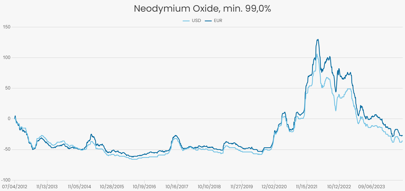The peak in April 2022 was followed by a steep decline caused by oversupply from China, fears of a recession in early 2023, and declining EV demand. I expect NdPr prices to decrease even further in the following months before they form a base.