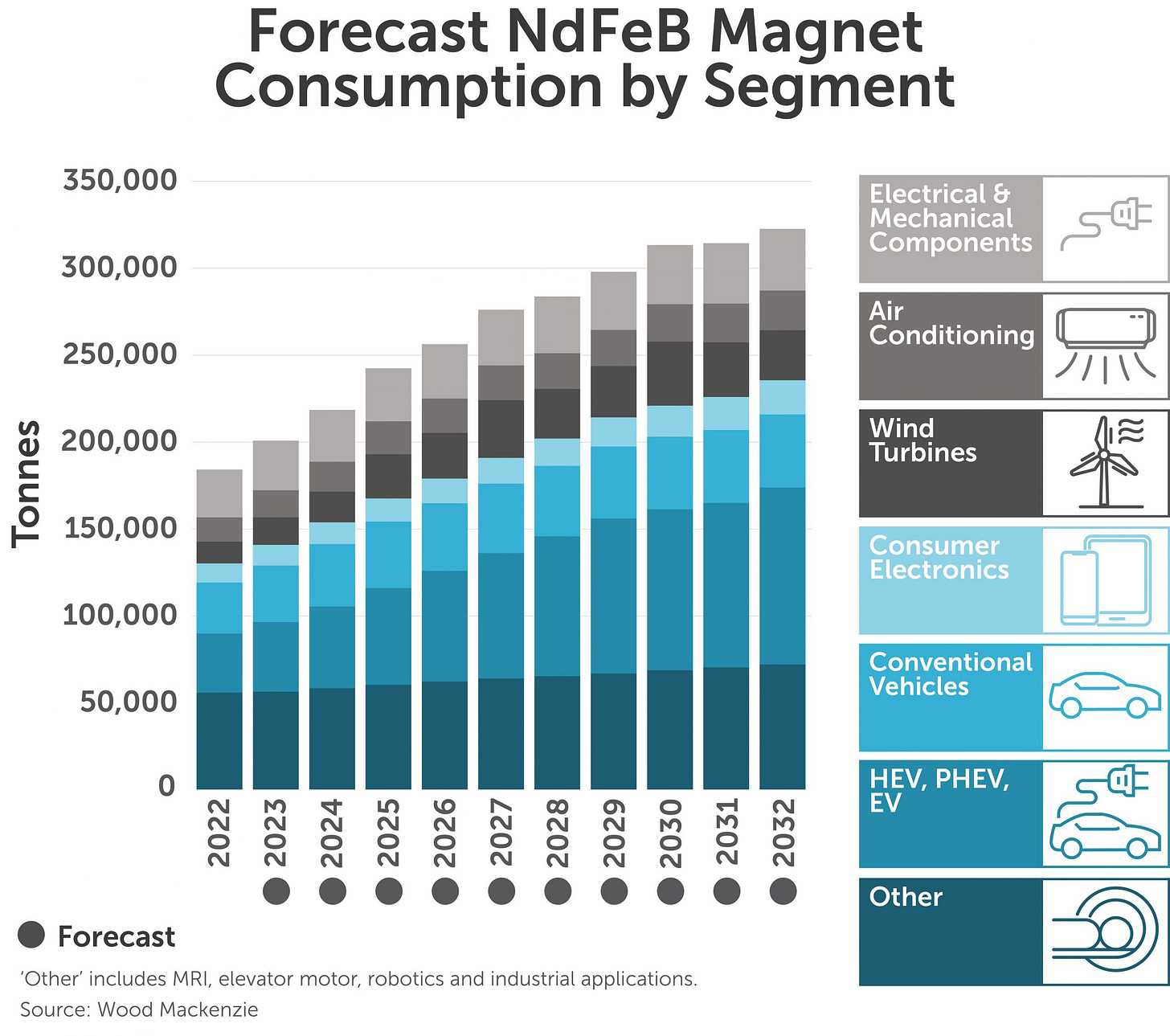 REEs used in NdFeB magnets account for 45% of the total rare earths production. NdFeB magnets are used in the automotive, wind turbines, and factory automation sectors. So, NdFeB demand is the prime driver behind NdPr oxide demand. Over the last two decades, NdFeB magnets have found applications in the automotive industry, such as electric drive trains, batteries, and electric steering.