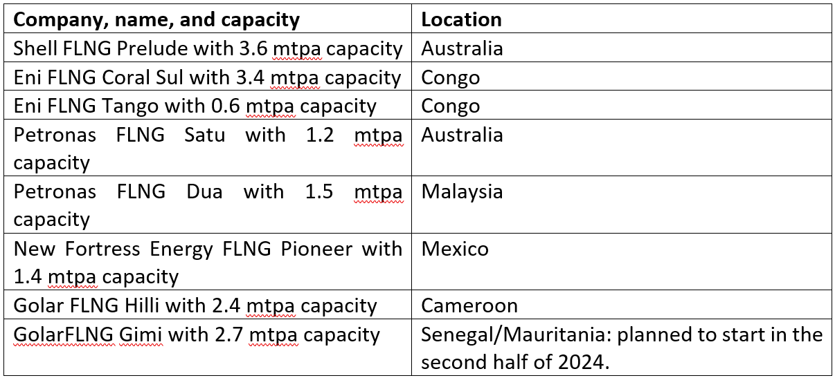 Let’s briefly review the FLNG market. Currently, active FLNG installations are counted on the fingers of both hands (the table is from the Golar LNG report):