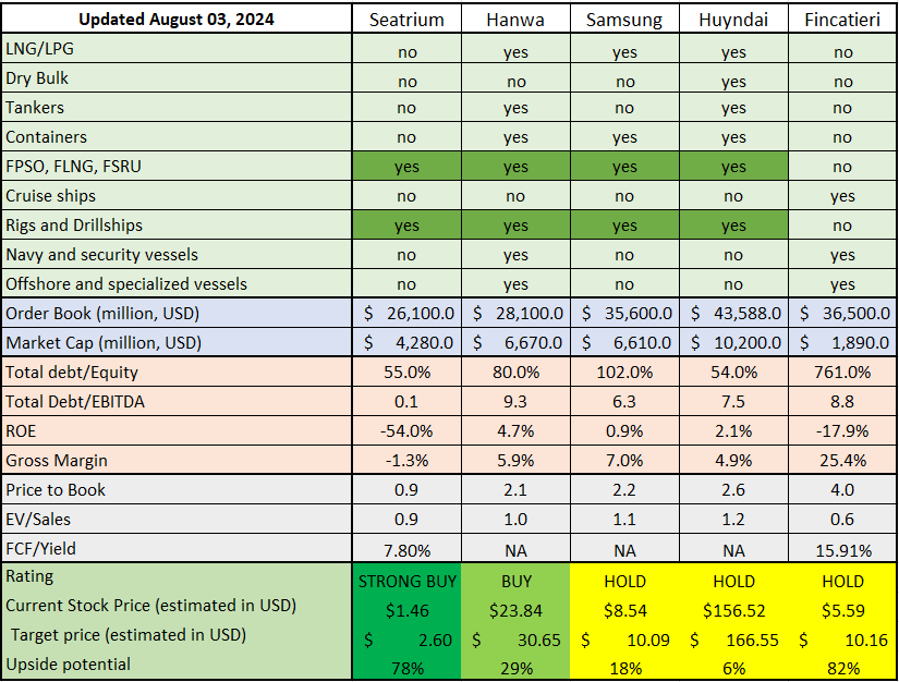 To compare Seatrium, I picked Hanhwa, Samsung, Hyundai, and Fincantieri. The latter mainly produces passenger ships for companies like Carnival (Carnival Plc) and vessels for the Italian Navy. I have deliberately included it because it gives additional context to comparing the shipyards. I am not a fan of Fincantieri because it produces wants, not needs. This makes the already turbulent business of shipbuilders even more extreme.