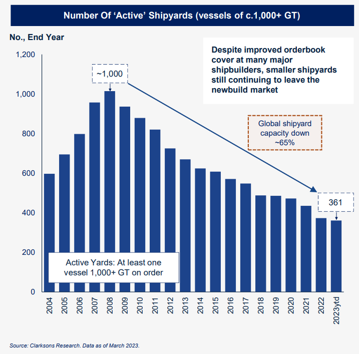 Building a vessel takes 12-36 months, depending on size and complexity. Building a shipyard can take longer. Conversely, vessel demand is erratic depending on fluid variables like day rates and second-hand vessel prices. Simply put, shipyard supply is slower compared to vessel supply.