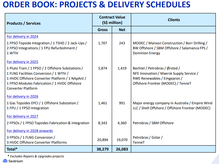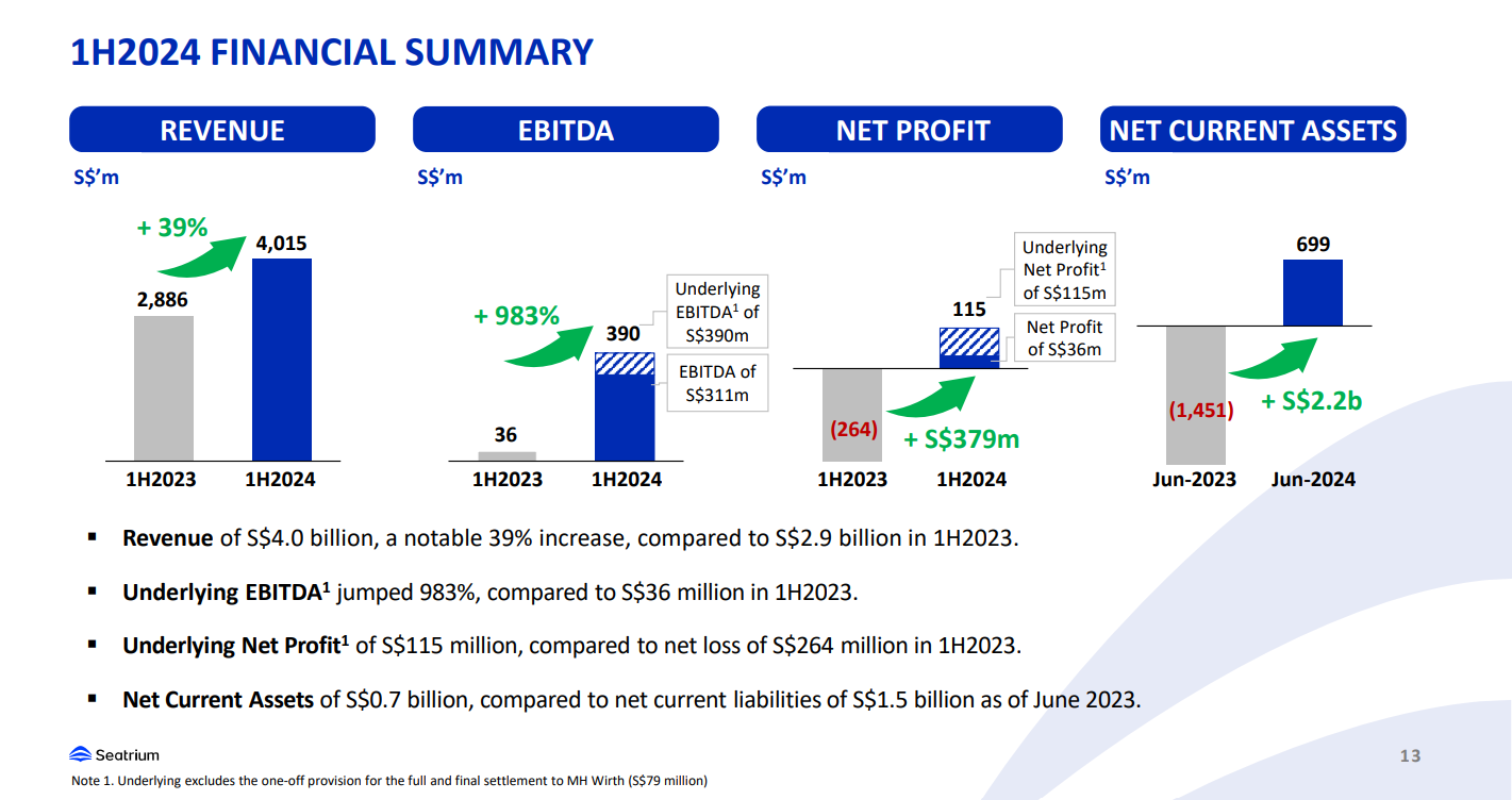 Judging by 2023 orders, I expect the Backlog to grow even more this year. The company's latest report, released today, August 02, 2024, confirms my observation. Seatrium recorded a $26 billion 1H24 backlog.
