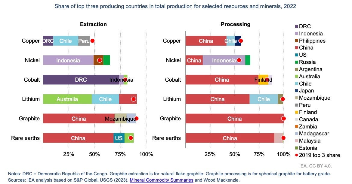 Energy independence is crucial. I am not talking only about fossil fuels. China dominates the extraction and processing of metals required to build power plants and infrastructure. The following graph shows how dependent the world is on China.