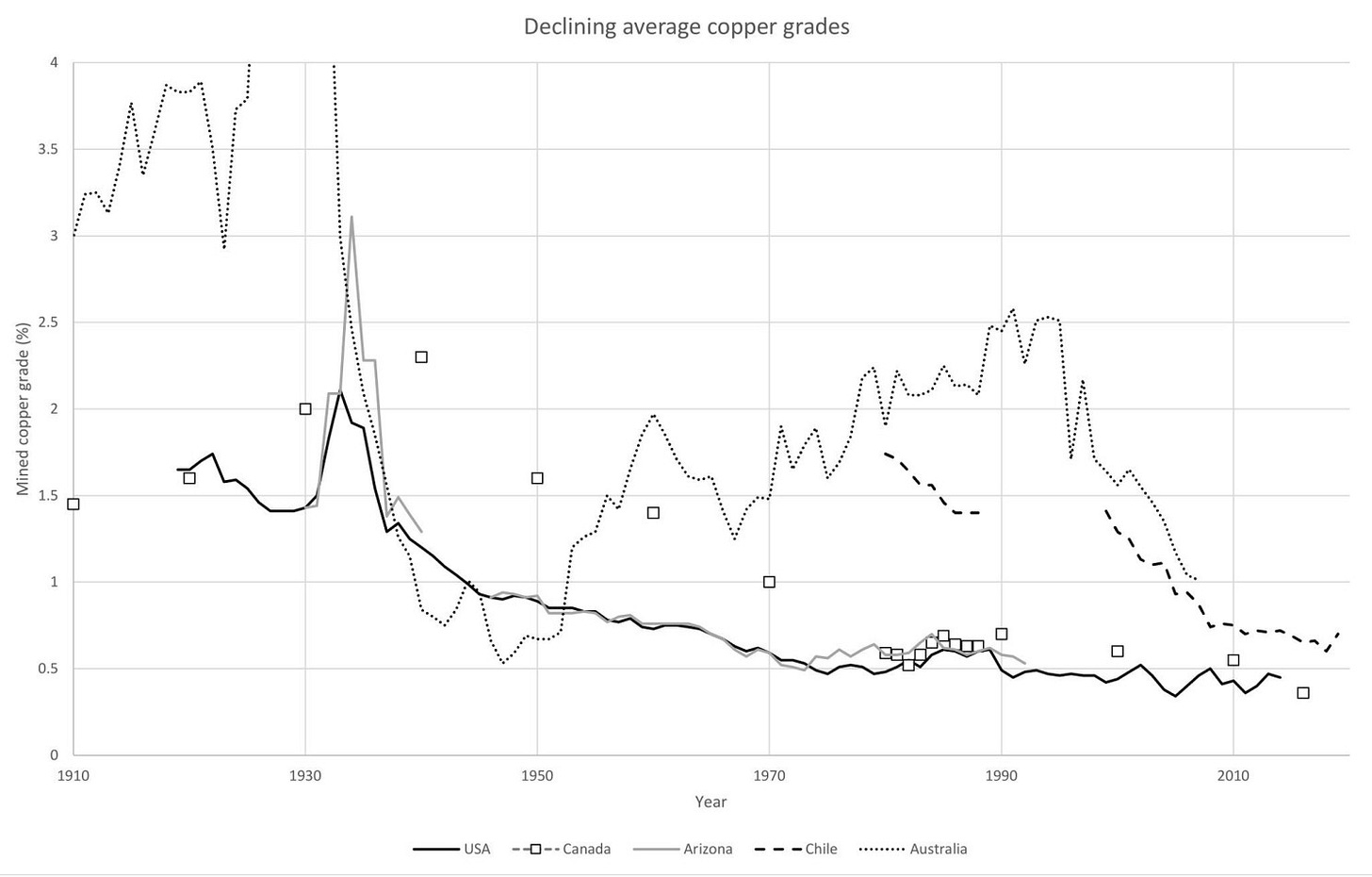 Ever-declining copper ore grades undermine the future supply. Ore grade determines how economically viable it is to extract and process the ore.