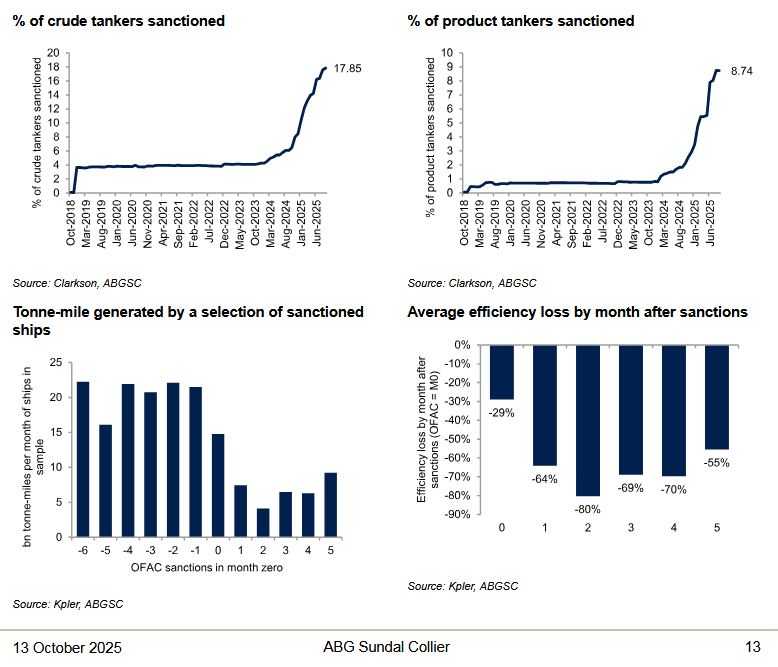 China’s new port fees will affect oil tankers, too. Approximately 30% of crude oil tankers, while only 19% of product tankers, face exposure. There is one more factor to consider for tankers: the size of the sanctioned fleet.